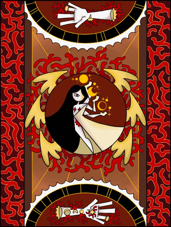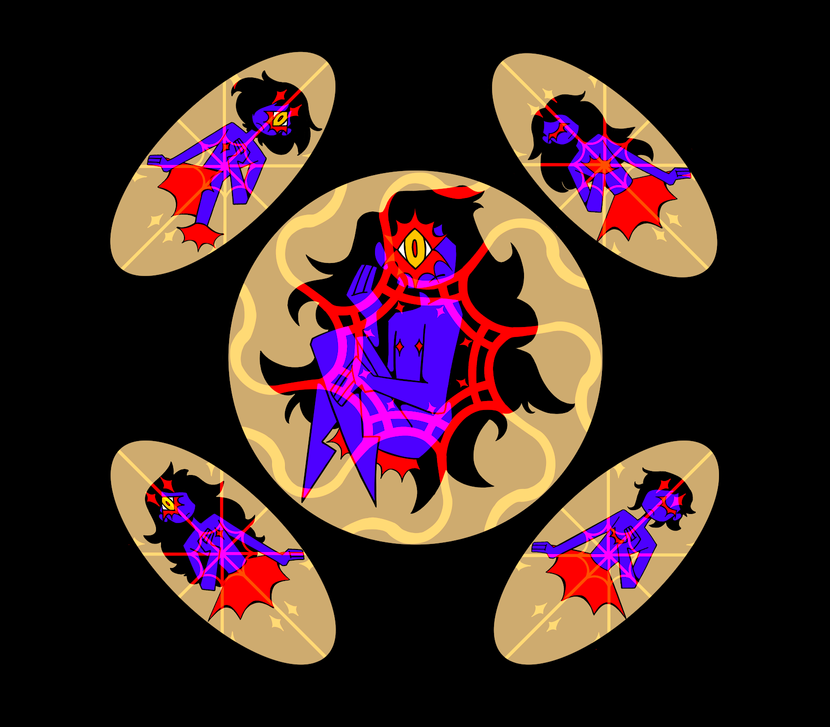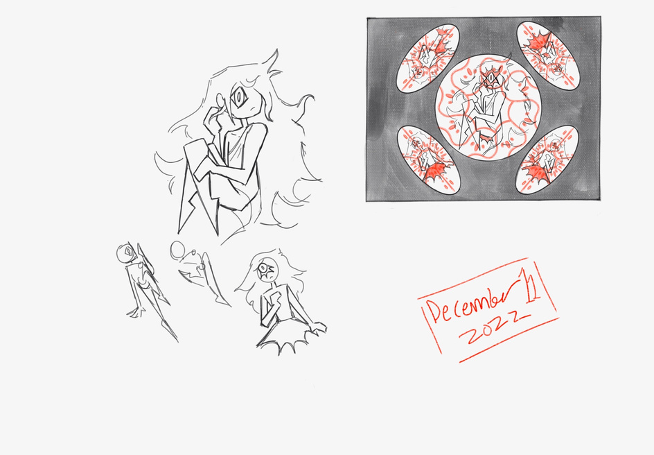 I was inspired by the patterns I'd seen in another piece from an artist from my class. The pattern inspired a design ended up looking a much like veins. next was to design the female character that sits In the middle of the piece, and her three arms and one eye was a striking look that ended up being perfect. after that the pallet of red gold and white fell into place.