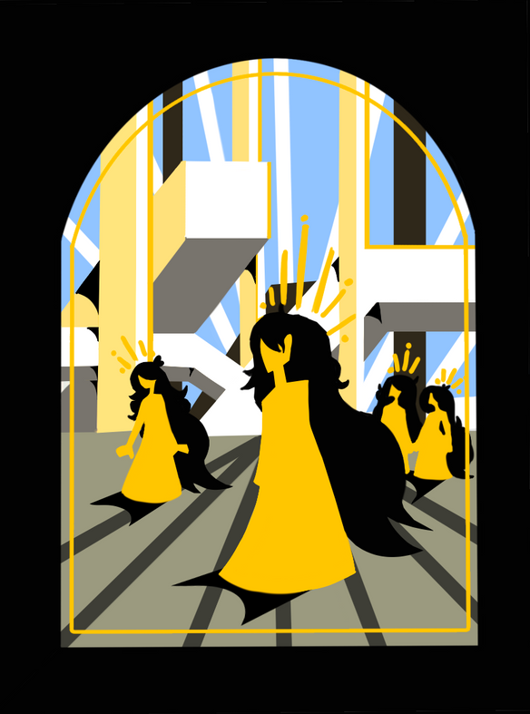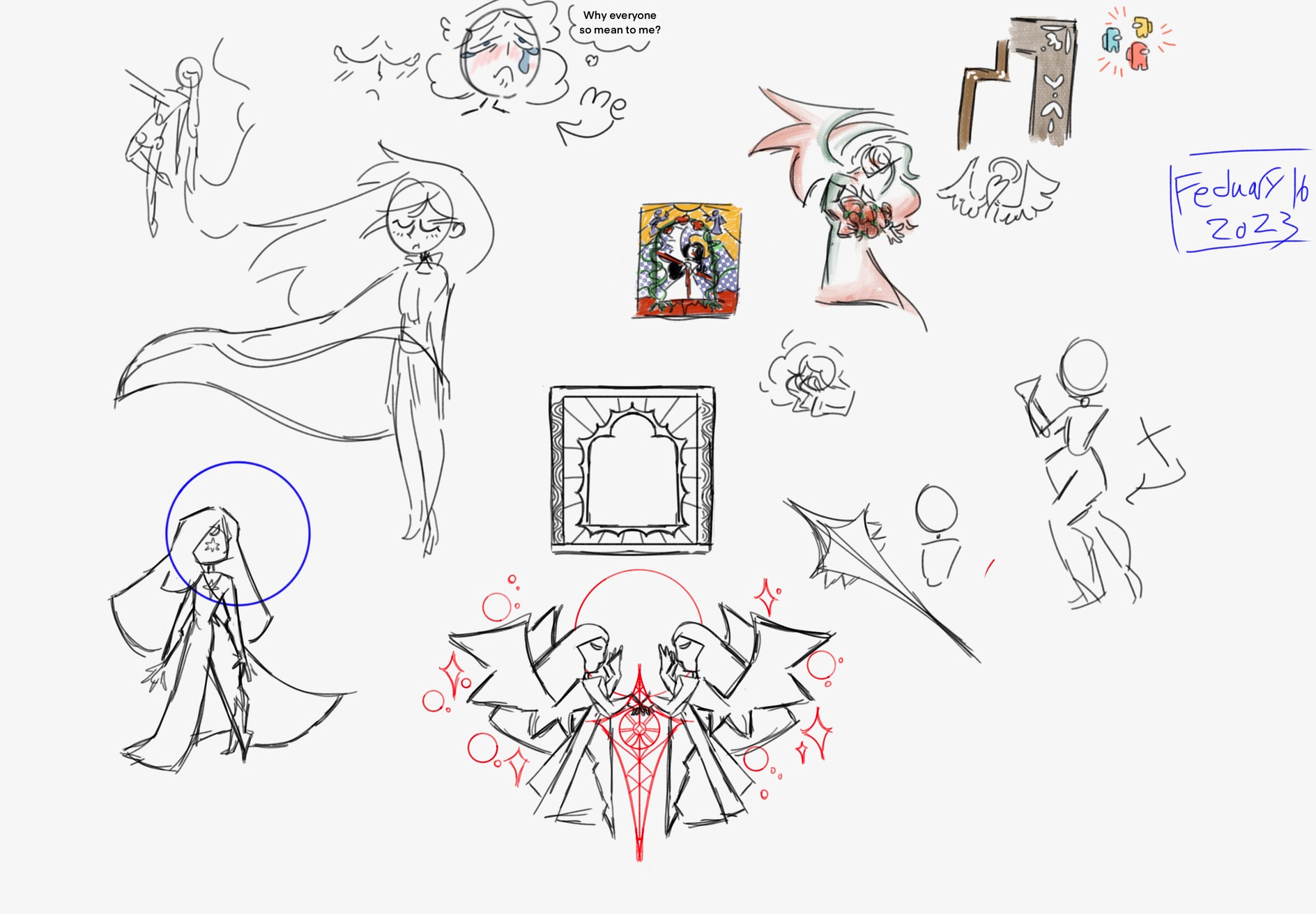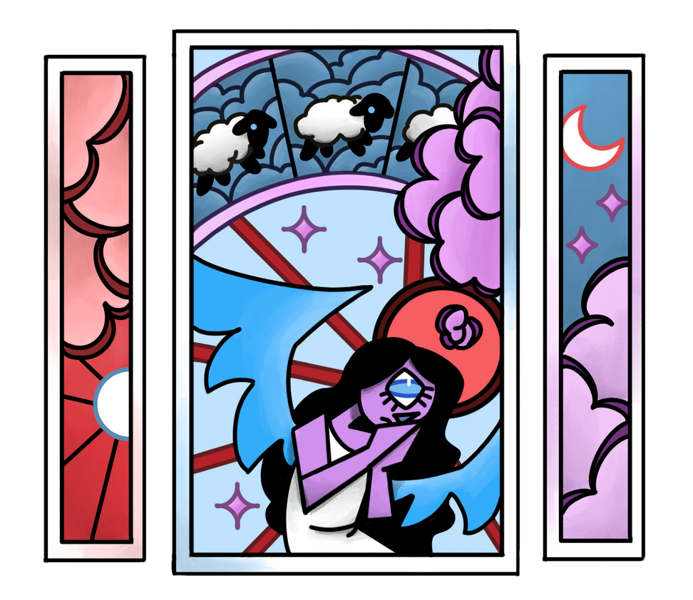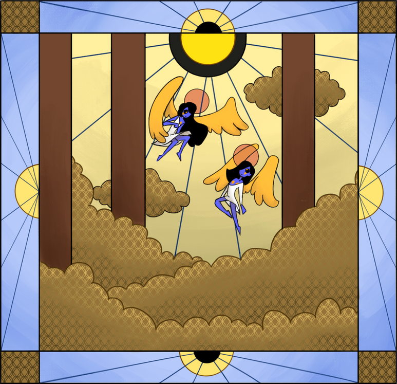 This was the first digital piece. I deliberated over this one for a very long time, it was hard to know what I wanted to incorporate, what it would mean about later pieces, how it would affect my later creative process- in a lot of ways it felt like the real first piece of my portfolio, at least to me. The claustrophobic feeling of the women trapped in the windows was the main idea, feeling trapped by the rose window. Hens the name. In a way, it's mostly about subservience, of being forced to not take up too much space. Weirdly this piece has a lot of stress wrapped up in it, but so do a lot of other pieces in my portfolio.