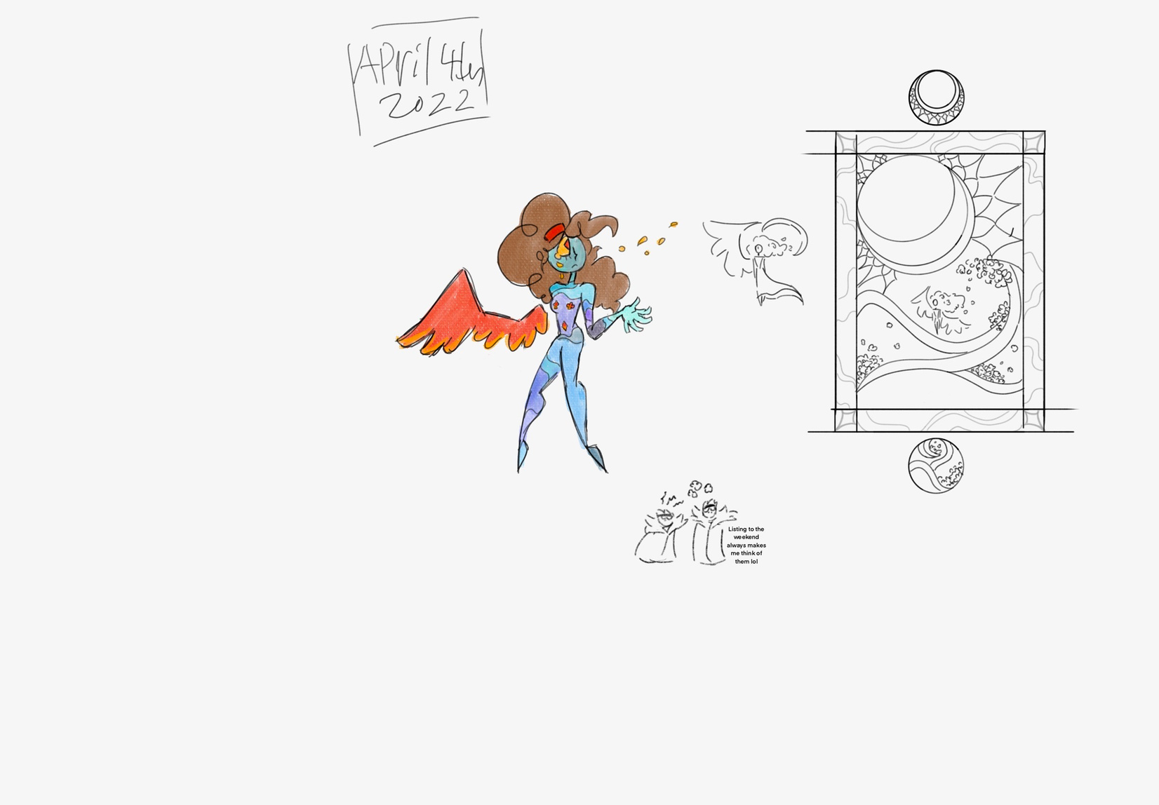 The sketch that inspired this one is nearly a year old, but I think it looks perfect. I won’t hide it, I absolutely love this piece. The colors and pose most of all. I really wish I had tried drawing more detailed hands earlier in the portfolio because I think they look great here, as opposed to the hand shaped triangles from the first few pieces. I suppose I wasn’t as good at drawing hands to start.