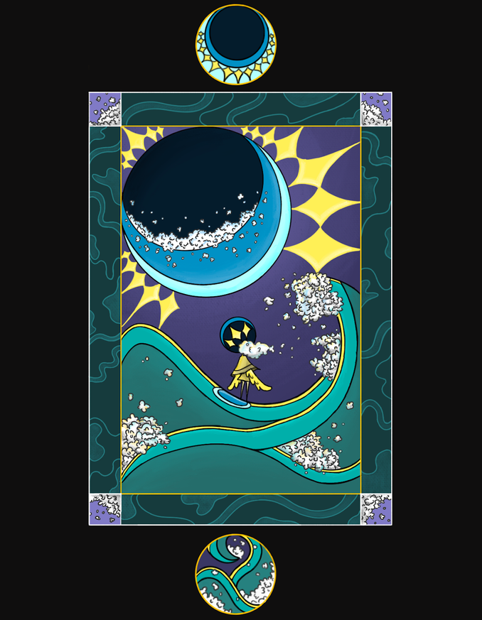 I was sad that the girl in the middle ended up so small, but in a way she’s the biggest thing in the piece if you notice the girl is connected to the moon. The original sketch in that inspired this also inspired Citizen Of the Stars, but both of the pieces ended up very different. I was most of all in this piece trying to show the danger of the ocean and nature.